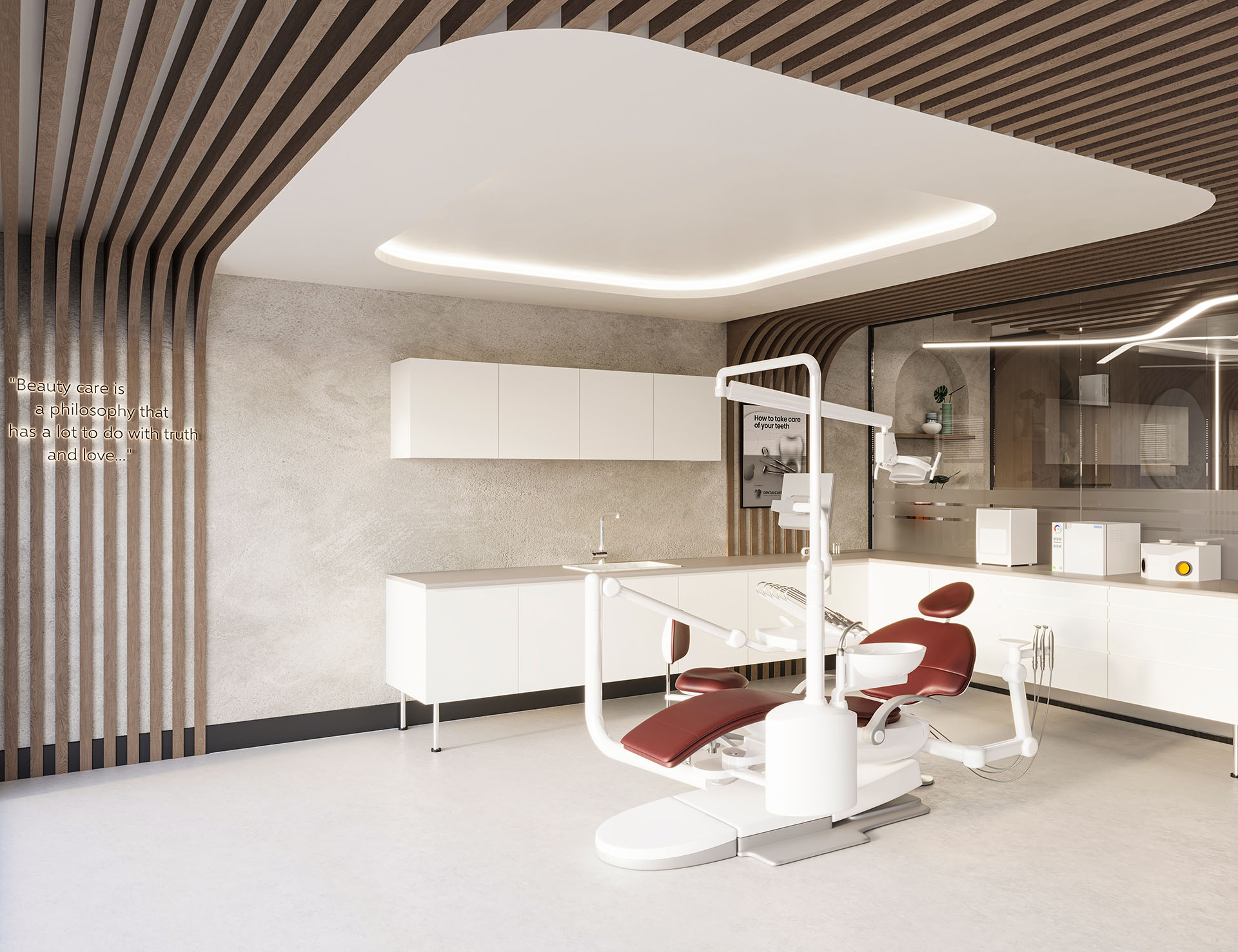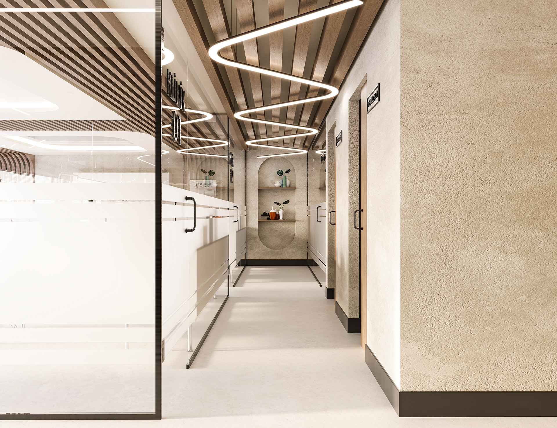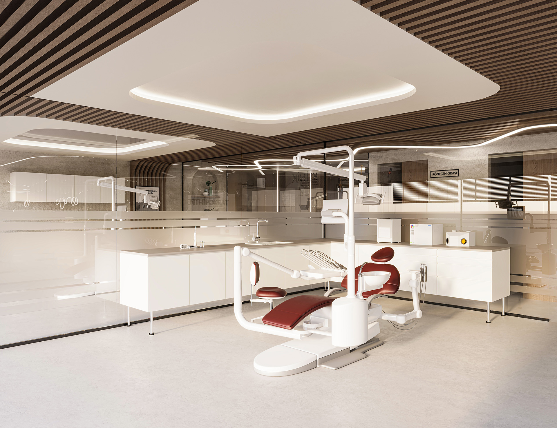 Proje alanı, kullanıcı deneyimini merkeze alan akıcı bir mekân kurgusuyla ele alınmıştır. Oval formlar ve yönlendirici aydınlatma çizgileri, mekân içinde sezgisel bir dolaşım oluşturarak kullanıcıyı doğal biçimde karşılar ve yönlendirir. Yumuşak geçişler ve dengeli ışık kullanımı, klinik ortamın stresini azaltmayı hedefleyen sakin ve kontrollü bir atmosfer yaratmaktadır.